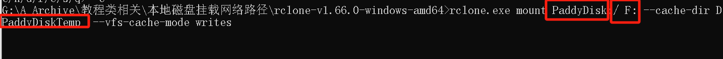 rclone.exe mount PaddyDisk:/ F: --cache-dir D:PaddyDiskTemp --vfs-cache-mode writes