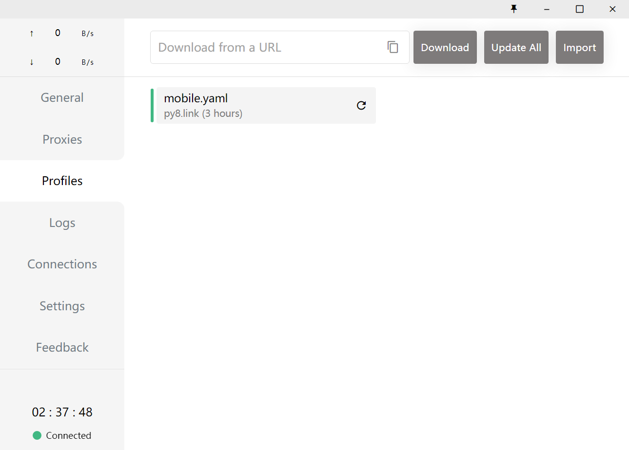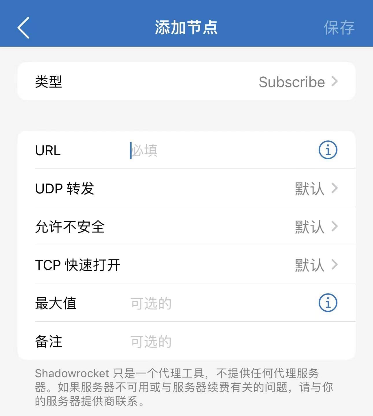 下载完成右上角加号选择订阅,URL填写你的配置文件地址即可一键读取你自己的所有配置,亦或者你根据实际协议类型手动一个一个加,也没毛病