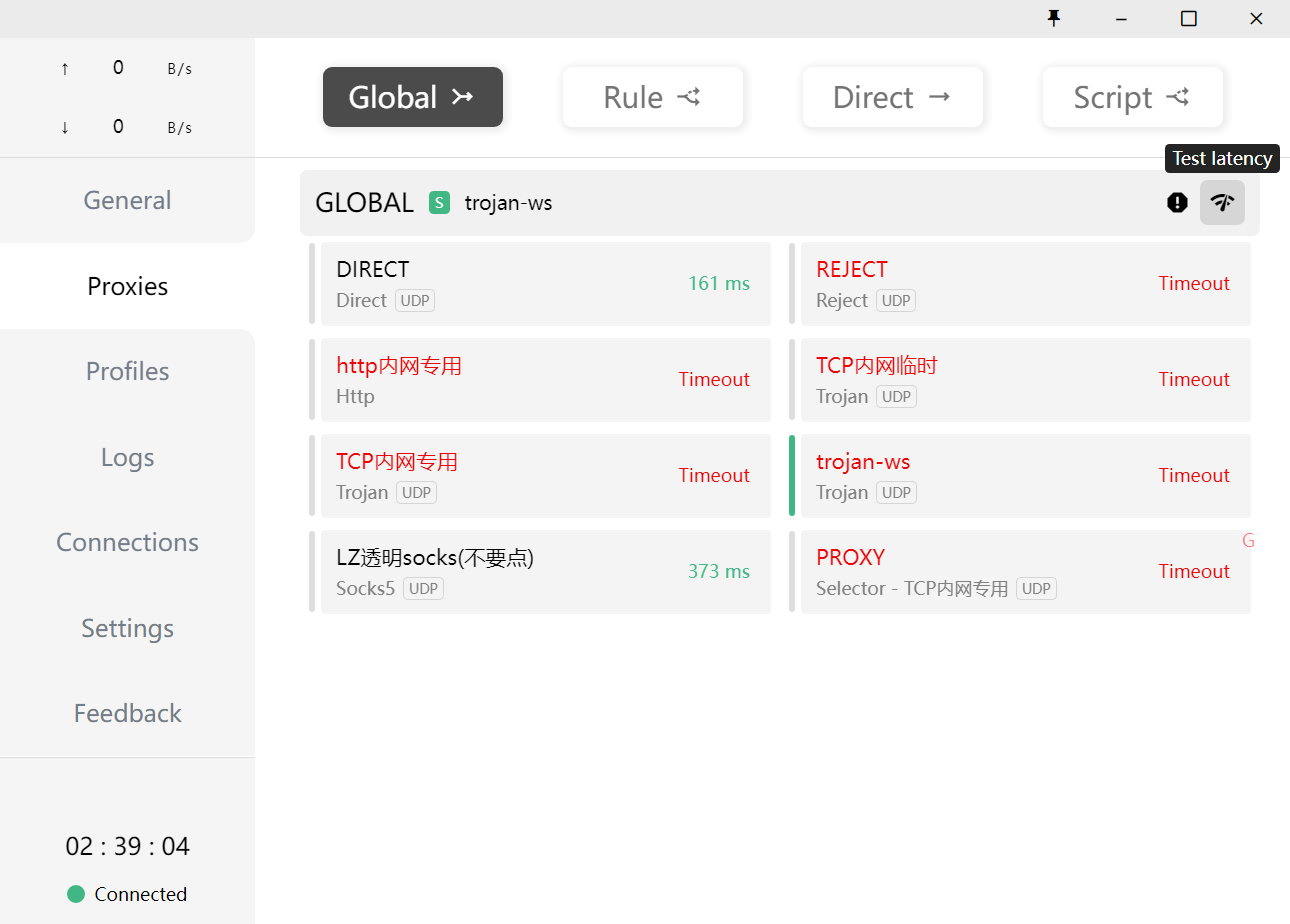 然后在代理界面可以选择全局/规则/直连/脚本,一般如果你自己规则写的好那就可以选规则,懒人如果不像写规则可以直接全局然后根据需求开关。右侧小按钮可以测试网络联通性,绿色代表当前使用的节点。