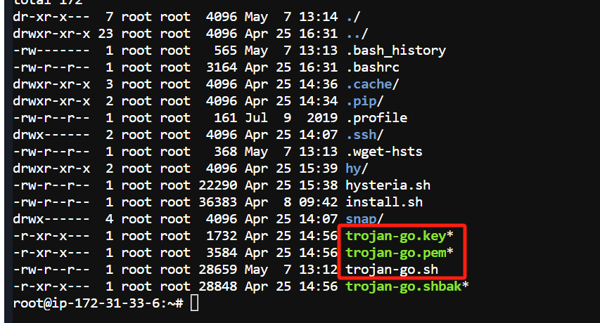 2、新建两个空文件trojan-go.key、trojan-go.pem,用来后续存放域名证书(域名非必须)。如果仅用于第一次学习,可以不使用域名证书,这一步的目的是通过SSL让你的代理流量进行加密,防止一些信息泄露。但是我写的脚本有校验这两个文件,所有空文件名也得有。