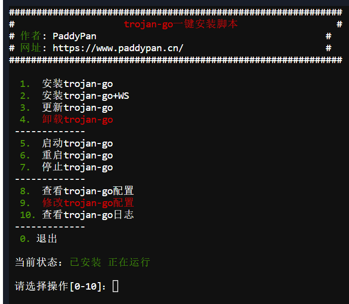 5、然后我们再次执行./trojan-go.sh,就可以进入脚本主界面了。